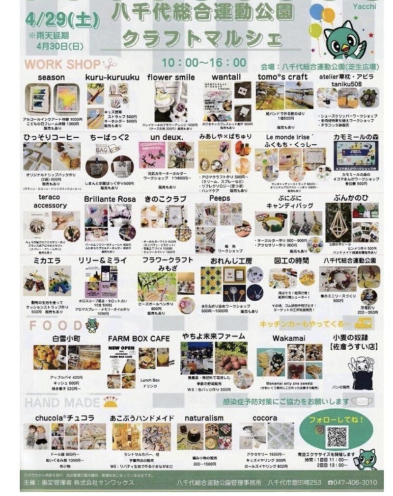 \八千代市総合運動公園クラフトマルシェ/ 八千代総合運動公園芝生広場にて第1回目となるクラフトマルシェ。ワークショップやハンドメイド作品の物販、キッチンカーで盛り沢山なクラフトマルシェにやちよ未来ファームも出店します。 日時:4月29日(土)10... -
